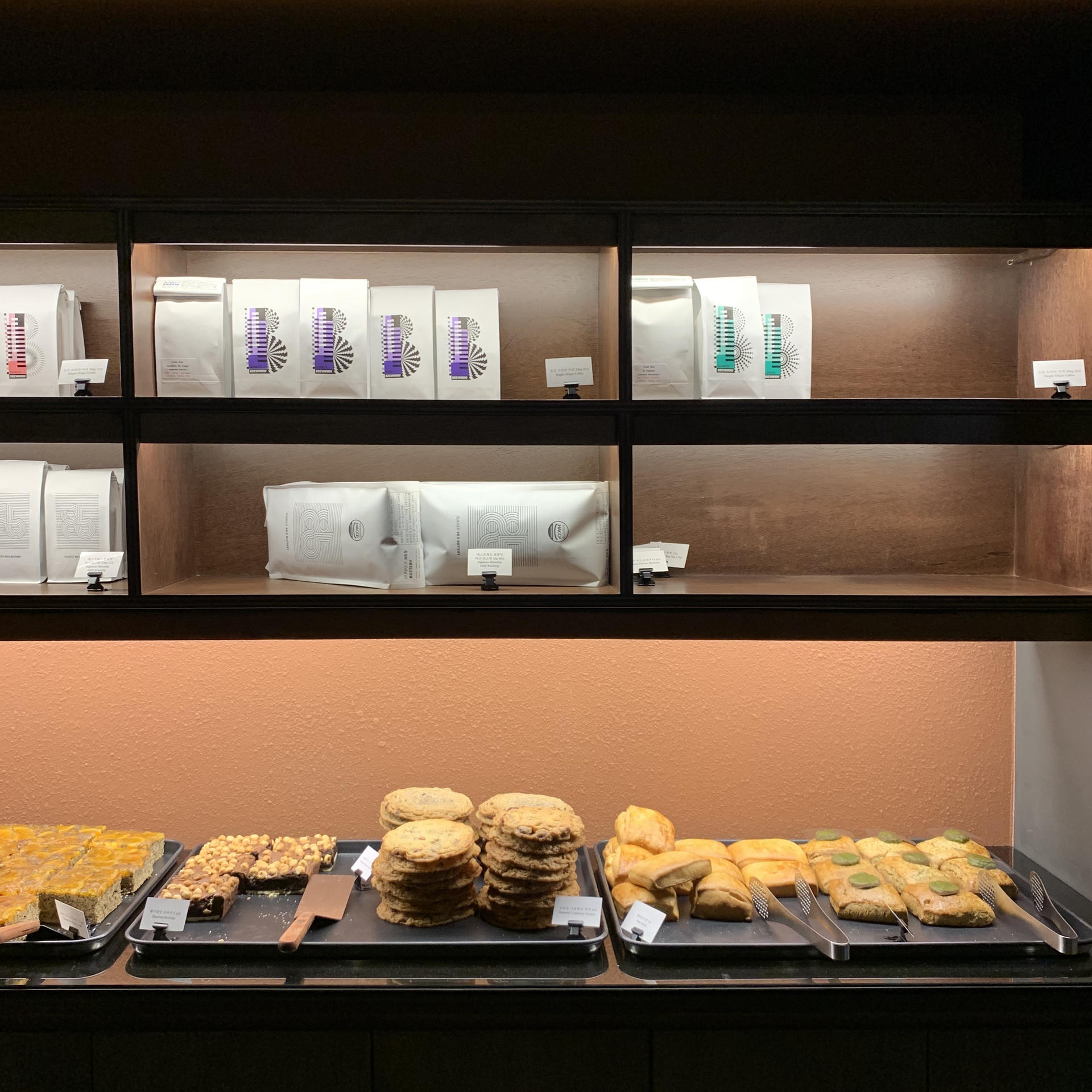 오픈 첫날이라 그런지 몇몇 화환도 보였고 내부엔 손님이 제법 있었으며, 무엇보다 오픈바 형식으로 되어있어 바리스타들의 분주하고도 생기넘치는 모습을 볼 수 있었다. 바 맞은편엔 원두와 함께 베이커리류가 놓인 선반이 있고, 그 옆으로 제빵실이 있다. 기본 에스프레소 메뉴와 함께 브루잉도 제공한다. 오기 전, 유튜브 ‘남자커피’ 채널을 통해 벙커컴퍼니 압구정점의 소개 영상을 보았다. 영상 속 거품이 더해진 브루잉커피가 궁금했지만, 시그니처메뉴이자 신메뉴인 ‘에스프레소베리’를 주문했다.