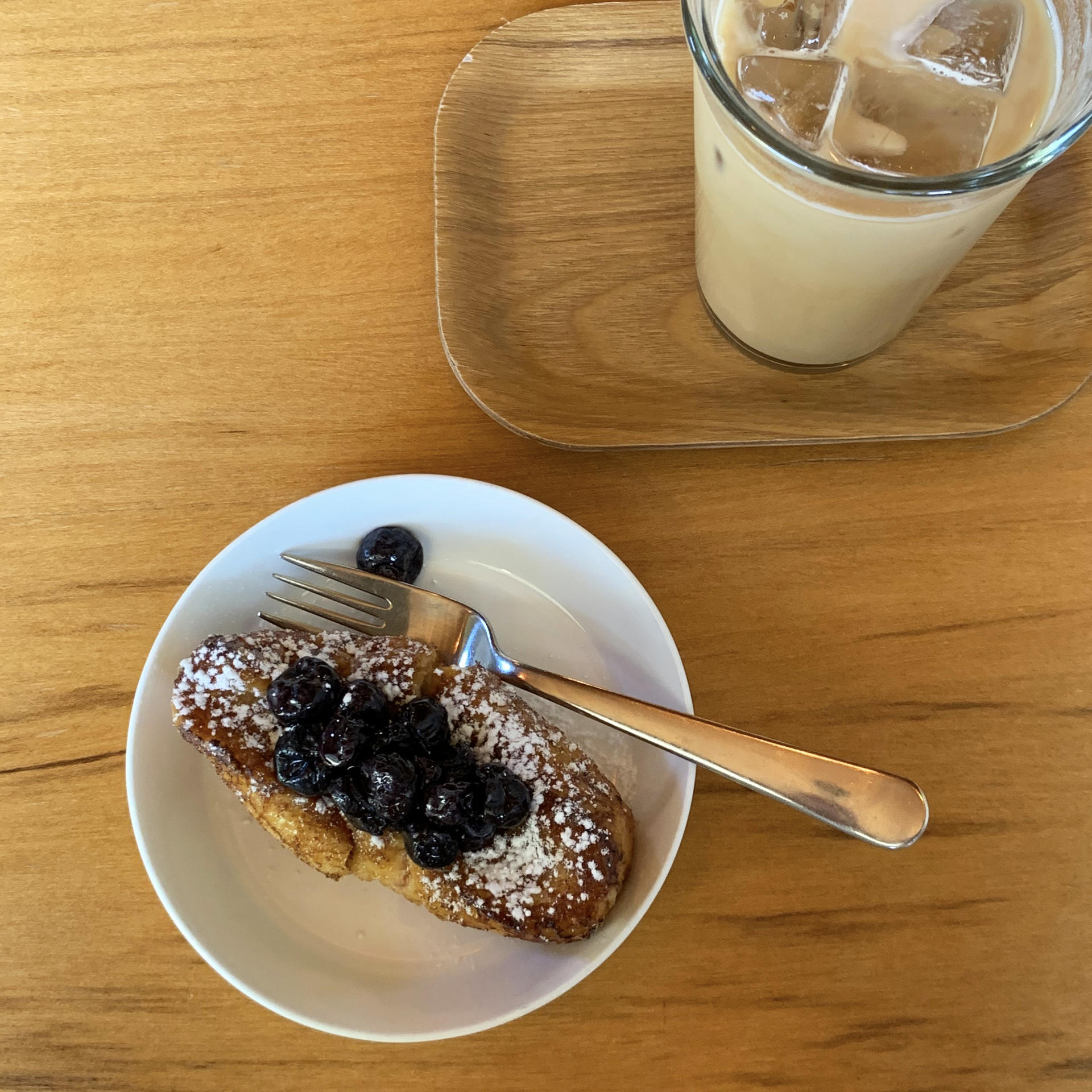 토스트는 굽는 데 조금 시간이 걸려 기다리는 사이 음료가 먼저 나왔다. 바닐라라떼는 평범했다. 다만 우유의 고소함보단 시럽의 맛이 더 두드러졌는데 그 맛이 그리 강하지 않아 괜찮았다. 뒤이어 나온 블루베리 키오스크 토스트. 겉은 얇게 그을러 바삭하고 안은 촉촉해 푸딩을 떠먹는 것 같이 부드러웠다. 절인 블루베리를 얹어 함께 먹으니 상큼 달달하면서 그 조화가 매우 좋았다. 또 계란 물에 오래 담가서인지 계란의 고소한 향도 느껴졌으며, 슈가파우더의 달달함까지 전해져 정말 맛있었다.