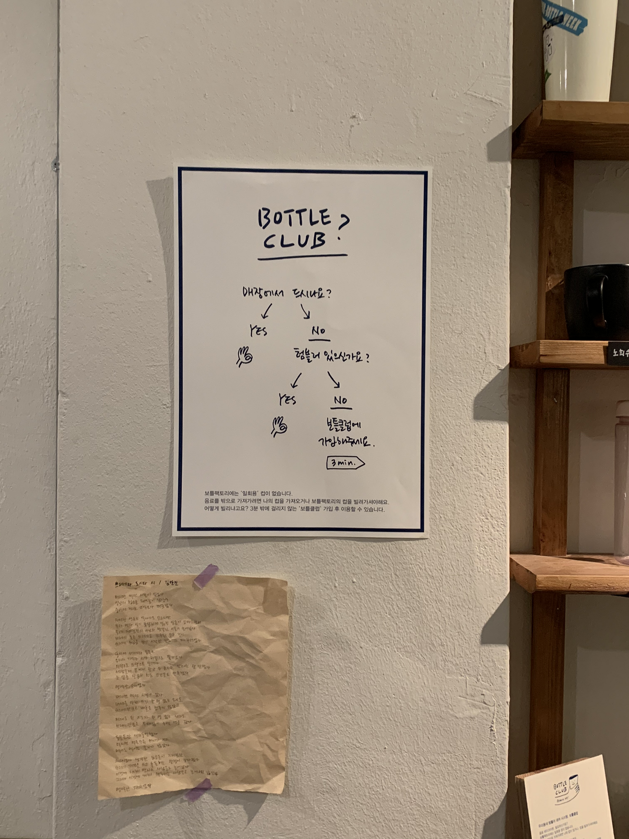 매주 다양한 목적으로 카페라는 공간을 찾지만, 이곳만큼 내게 여운을 남기는 곳은 없었다. 내가 사 먹는 커피 한잔, 빵 한 조각, 머무는 자리에 대해서도 되돌아보게 만들기 때문이다. 보틀라운지는 우리가 나아가야 할 미래를 부지런히 제시한다. 우선 이곳은 일회용품을 일절 사용하지 않는다. 대신 손님들에게 텀블러를 빌려주고 나중에 돌려받는 ‘보틀 클럽’ 제도를 운영한다.