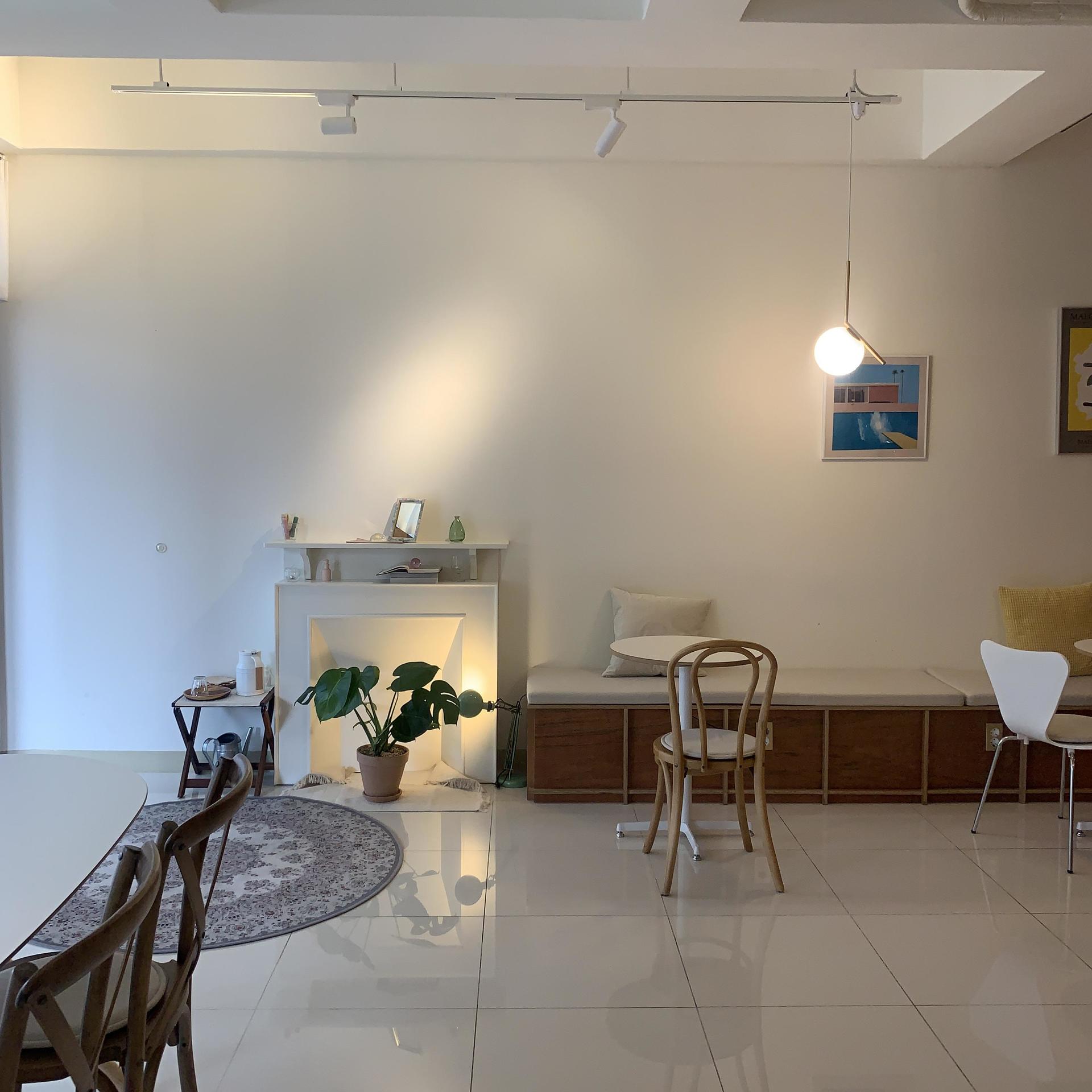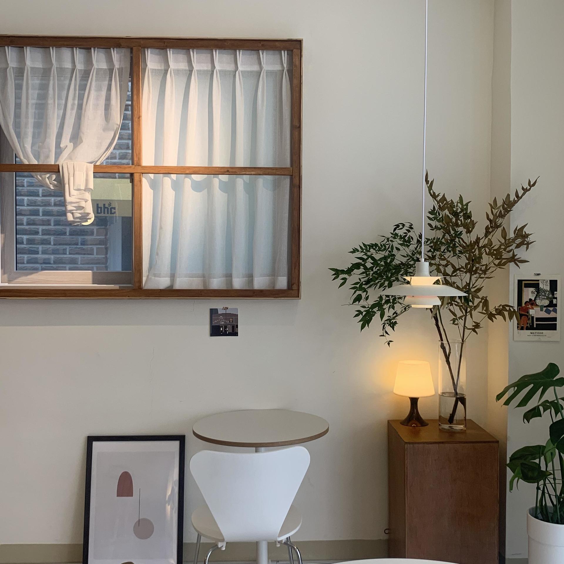 내부는 그리 크지 않다. 여느 동네 카페와 마찬가지로 먹자골목 속에 위치해 있기 때문에 동네 주민들이 많이 오간다. 동네 카페답게, 사장님의 인상은 밝고 서글서글하다. 화이트와 우드의 조화 그리고 곳곳에 보이는 식물들이 카페의 분위기를 더욱더 고즈넉하게 만들곤 했는데, 해가 쨍한 낮 시간대에 방문했음에도 마치 노을 진 어스름한 저녁이 생각나던 내부였다. 심플한 흰 벽지에 걸려있는 추상적인 포스터와 엽서들, 적당히 쌓여있는 책과 소품들은 나뭇가지에 내려앉은 흰 눈처럼 정적인 공간에 생기를 불어넣어 주었다.